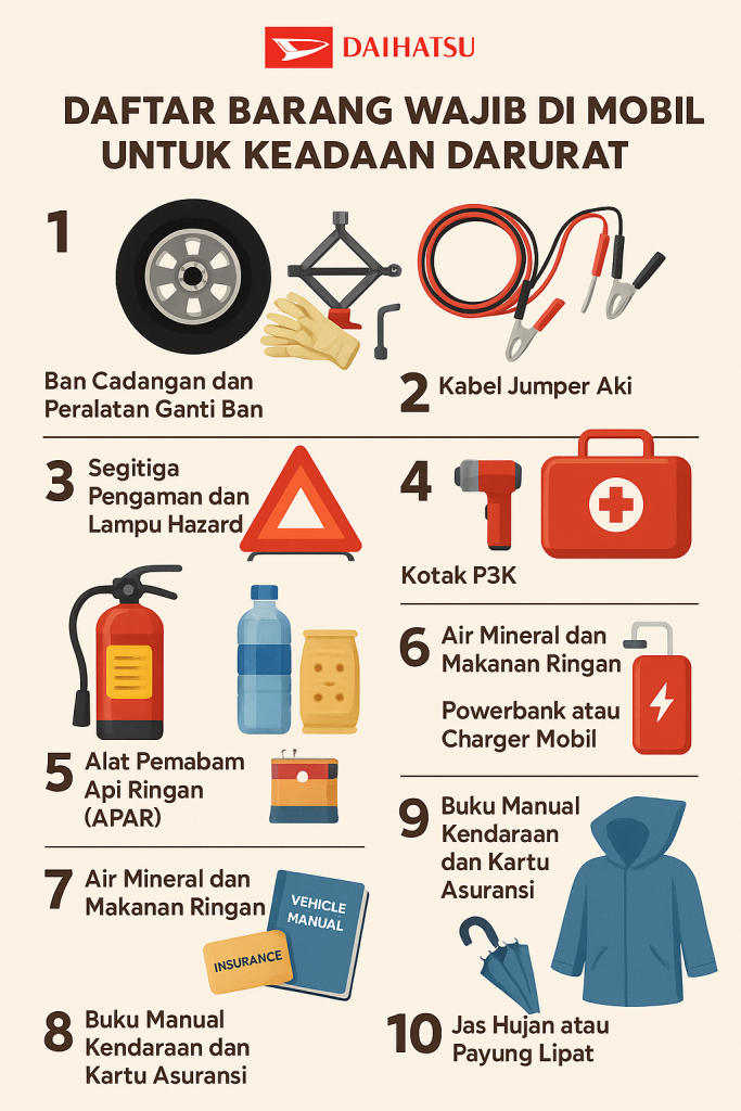 Keadaan darurat bisa datang kapan saja tanpa diduga. Dengan membawa barang-barang penting di atas, Anda bisa lebih siap menghadapinya. Selain itu, lakukan servis berkala di bengkel resmi Daihatsu agar mobil Anda selalu dalam kondisi prima dan aman digunakan.