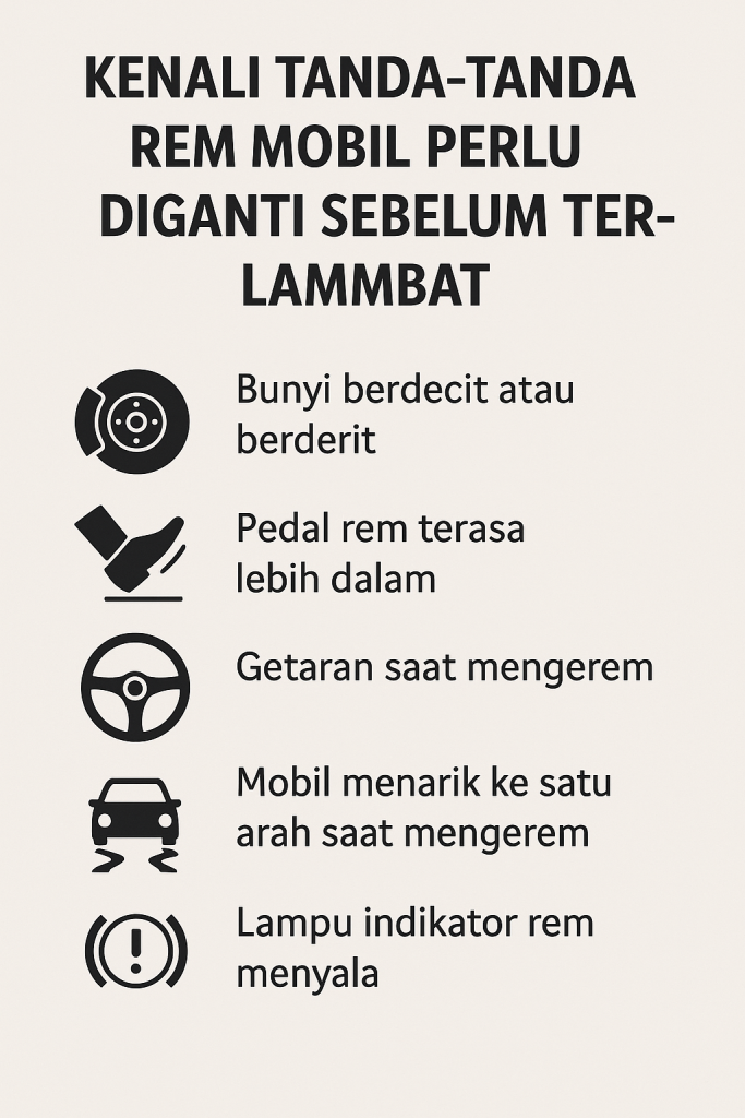 Jangan menunggu hingga rem benar-benar rusak. Kenali dan waspadai tanda rem mobil perlu diganti, dan segera lakukan perawatan jika gejala mulai muncul. Keselamatan Anda di jalan bergantung pada rem yang bekerja dengan baik!